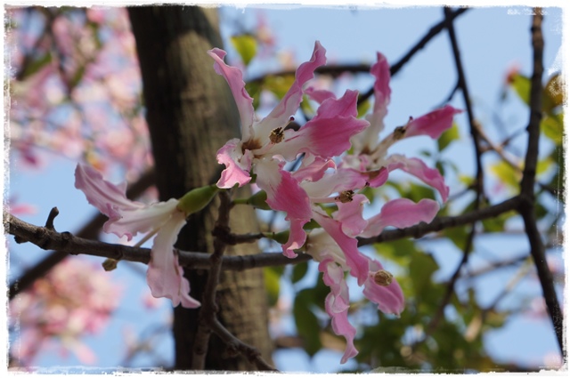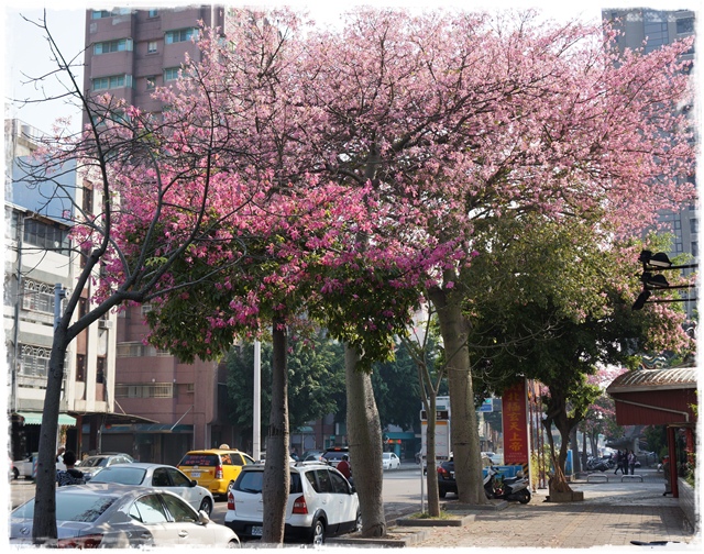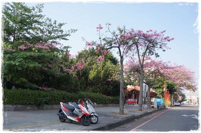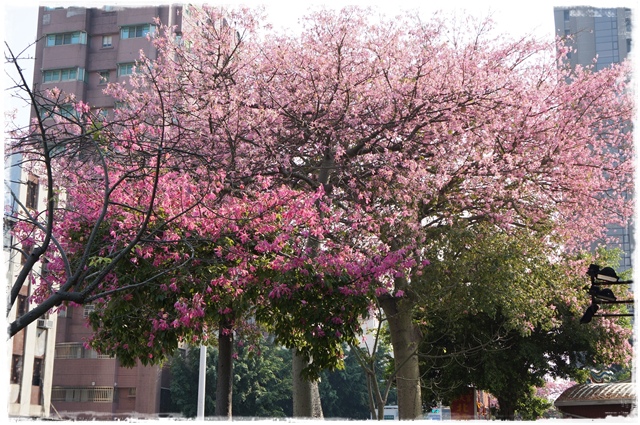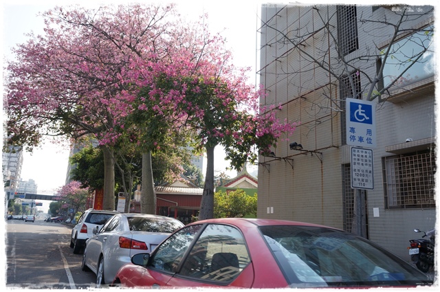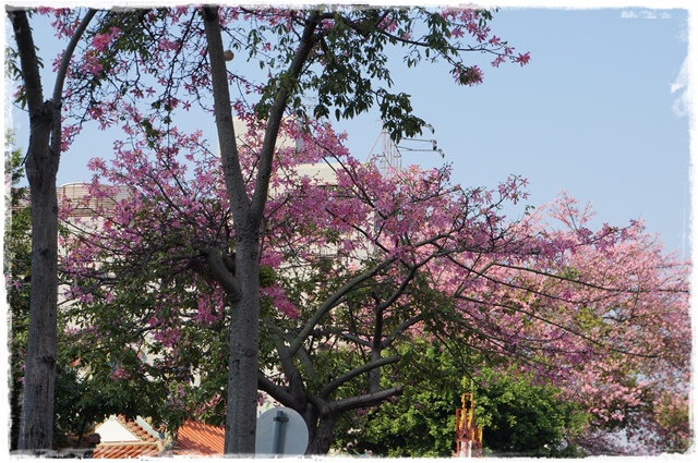 今年九月左右在台北的國家考場附近看到美人樹,外觀艷麗,十分吸睛。雖然美人樹總是常見於行道樹,但是槑槑卻是第一次發現她美麗的模樣。詢問苳苳之後才知道此花名為美人花,花名取得極好,一直想找一個可以好好欣賞美人櫻、拍攝她粉嫩模樣的好地方。這次去台中看到這片有如櫻花街道般,十分壯麗的美人櫻景象。不由得停下腳步,慢慢欣賞。尤其是位於尊天宮前這棵美人樹,不僅最大株,呈粉紅色的花朵濃密茂盛,樹葉也幾乎掉落,整個樹冠都佈滿著美人櫻。