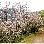 櫻花開滿步道旁,相當美麗,搭配遠處仍綻放的山櫻,呈現深淺交錯的顏色