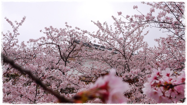從家康公雕像的廣場往天守門的方向張望,到處都充滿著櫻花,好像張滿了整片粉紅色天空