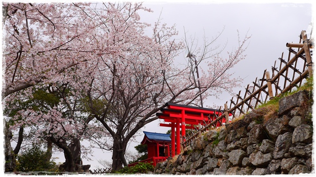 鮮紅色的鳥居排列於櫻花樹下,看起來相當顯眼。