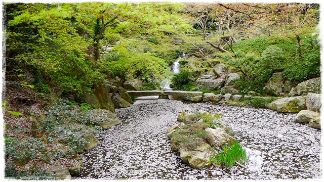 落英紛飛,花瓣灑滿了庭園裡的せせらぎの池