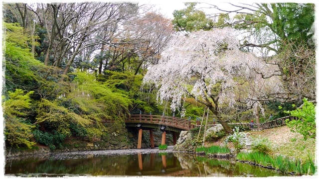 翠綠平靜的水面有如一面鏡子,應上支垂櫻的倒映,架上一彎古典木橋,相當雅致。
