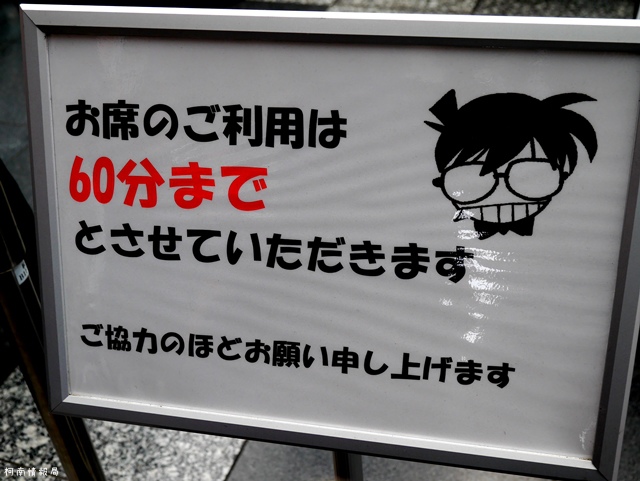 店前放上菜單的看板與用餐時間60分鐘的柯南看板。