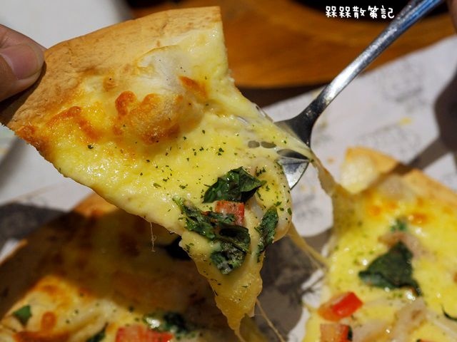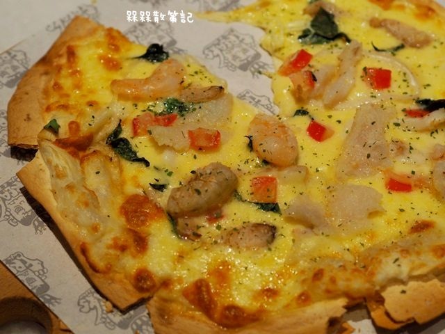 薄脆的餅皮口感和平常吃的薄餅pizza也略有不同,這種脆度與咀嚼的口感,讓人像是在吃蘇打餅乾。