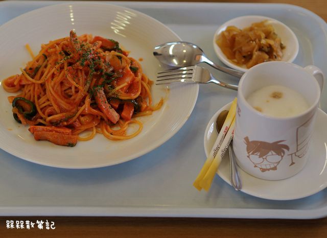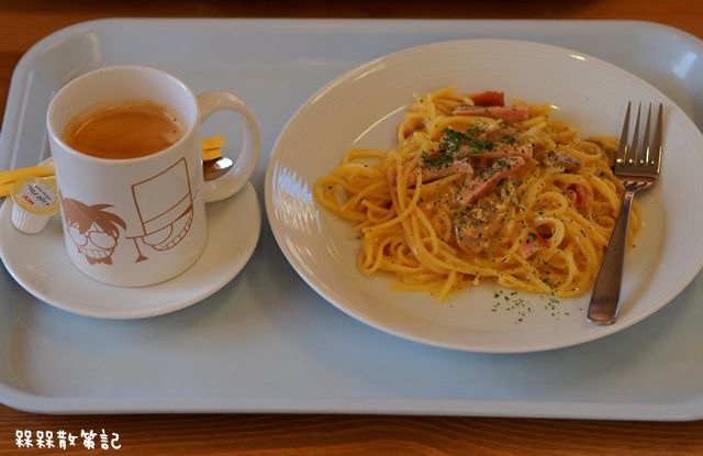 食卷機上面貼著許多柯南,店內也有販售兩款貼著柯南圖案的名偵探柯南咖啡,原本以為名為柯南,自然會有拉花圖案。結果竟然只是用柯南圖案的咖啡杯盛裝,有點可惜。