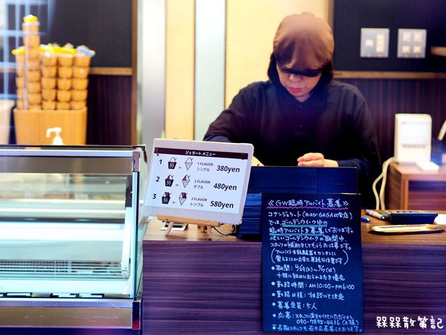 CONAN GELATO就位於柯南百貨店同一間建築,門口放著柯南穿著福爾摩斯偵探衣裝和小蘭一起的石牌,店內空間雖然不大,但是我想這間義式冰淇淋店是幾間飲食店中,最能吃到當地食材的店面了。