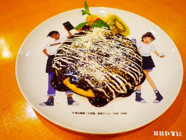 對我來說這道餐點算是還不錯又有特別設計過的。此外,盛裝的盤子還特別依照鬆餅大小印製平次和和葉,兩人的圖案剛好會顯現在盤子兩旁,整盤甜點看起來更有"名偵探柯南咖啡廳"的感覺。