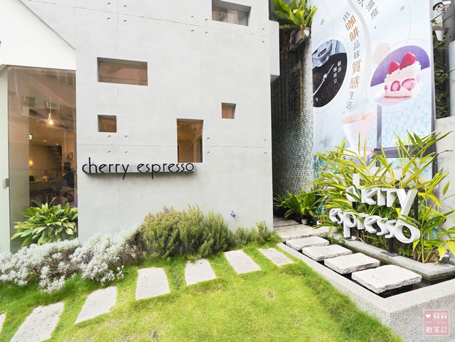 cherry espresso的招牌置於綠草間,由草地延伸出去的石板步道,下有水塘,有魚在優遊,閒適的氛圍在都市叢林中變得獨樹一格,彷彿能在這裡尋覓遠離塵囂的那片空間。