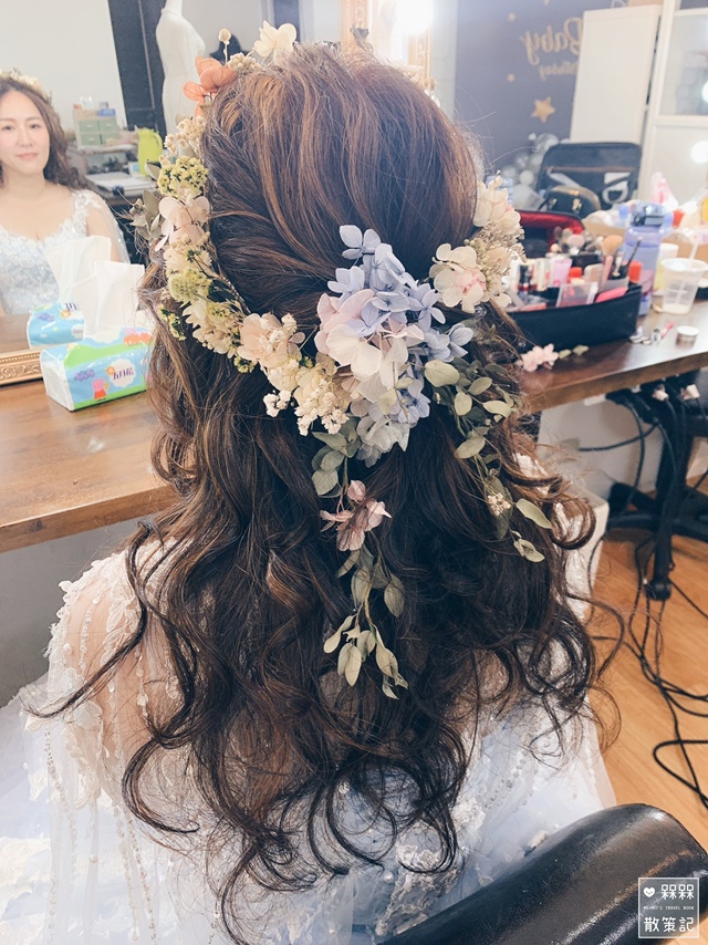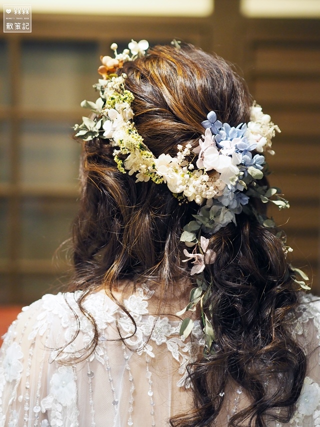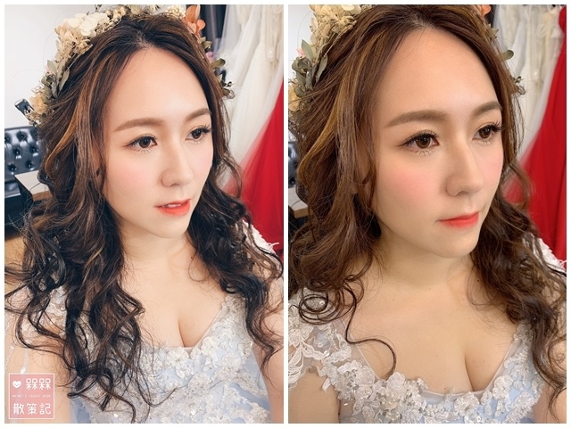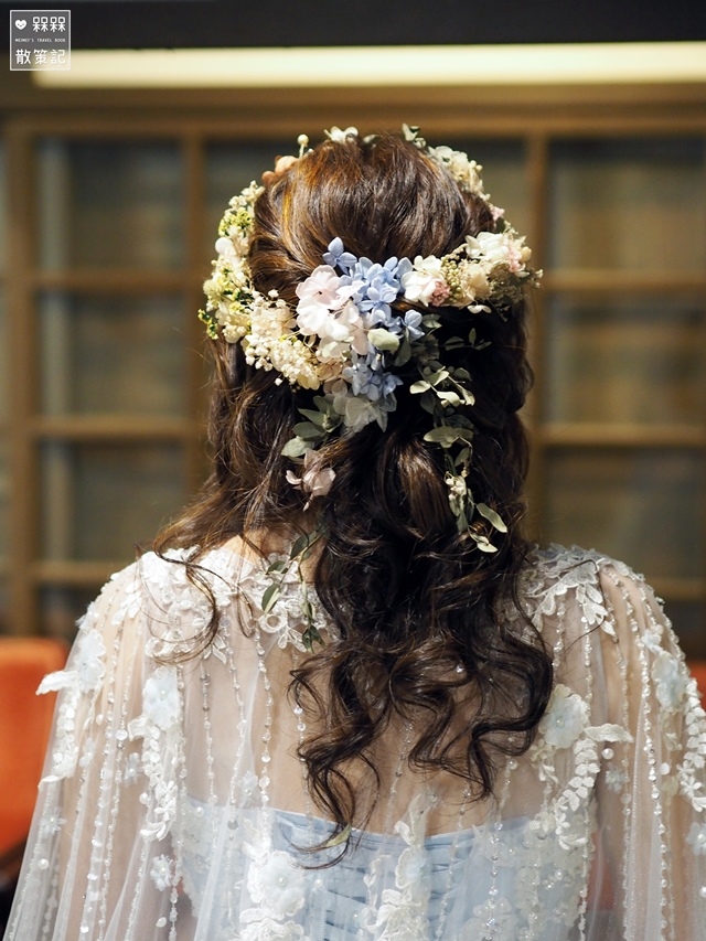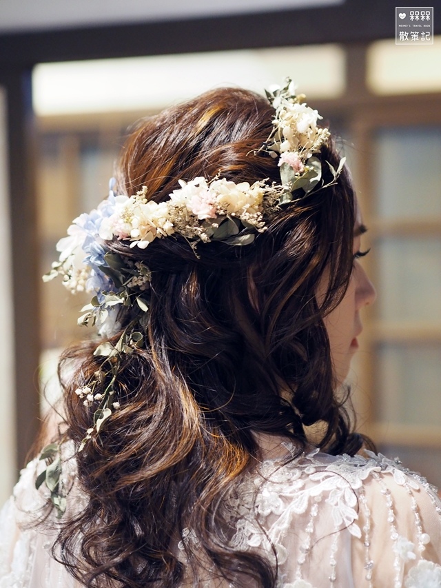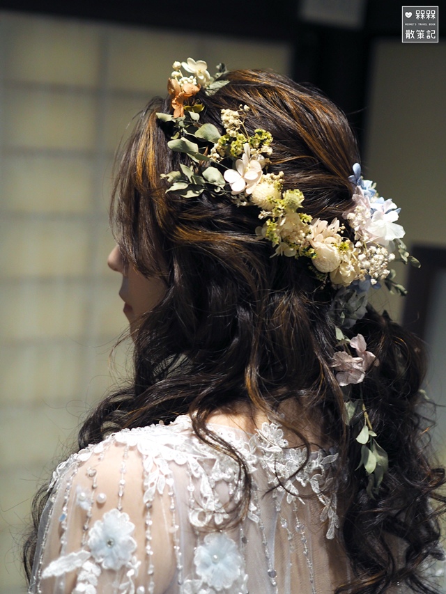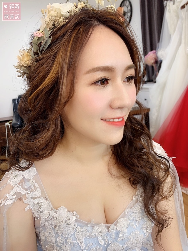 除了化妝的細心外,老師也會配合場地、禮服與我的喜好來設計專屬這場輕婚紗的整體造型。