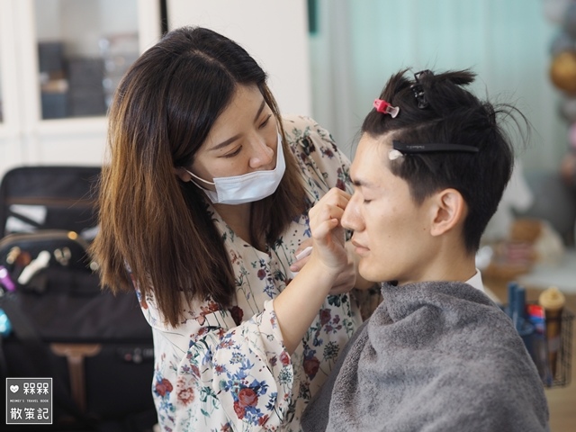 我的部分完成後,就輪到新郎的部分了!即使是單妝造型的服務,老師針對新郎的妝髮也相當認真,並特別參考了之前的婚紗照,讓新郎能挑戰和過去不同,煥然一新的復古造型。
